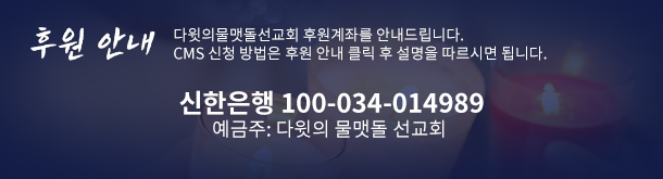 회사명 : 다윗의물맷돌선교회 / 대표 : 김주한 주소 : 경기도 안양시 만안구 석수동 268-1 4층 사업자 등록번호 : 301-82-87532 전화 : 010 7125 8357 개인정보관리책임자 : 김주한
